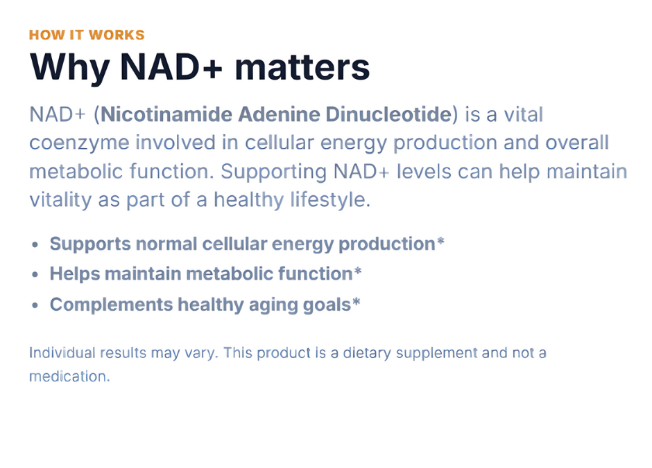 The complex works by providing key precursors that favor metabolic fire. It helps maintain a healthy balance in your cells, allowing for sustained vitality without the crashes associated with stimulants.